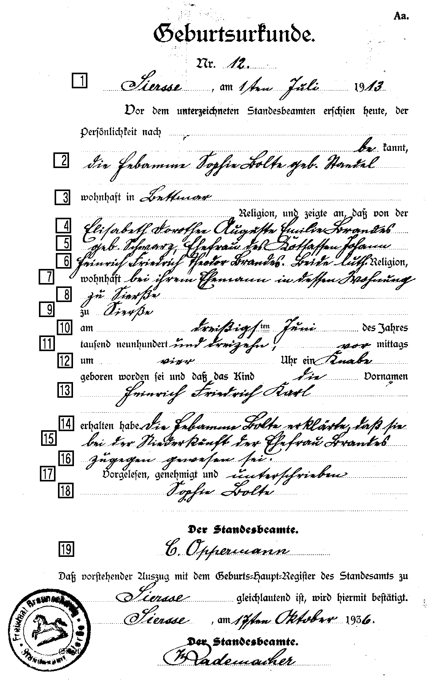 Geburtsurkunde Brandes(?)